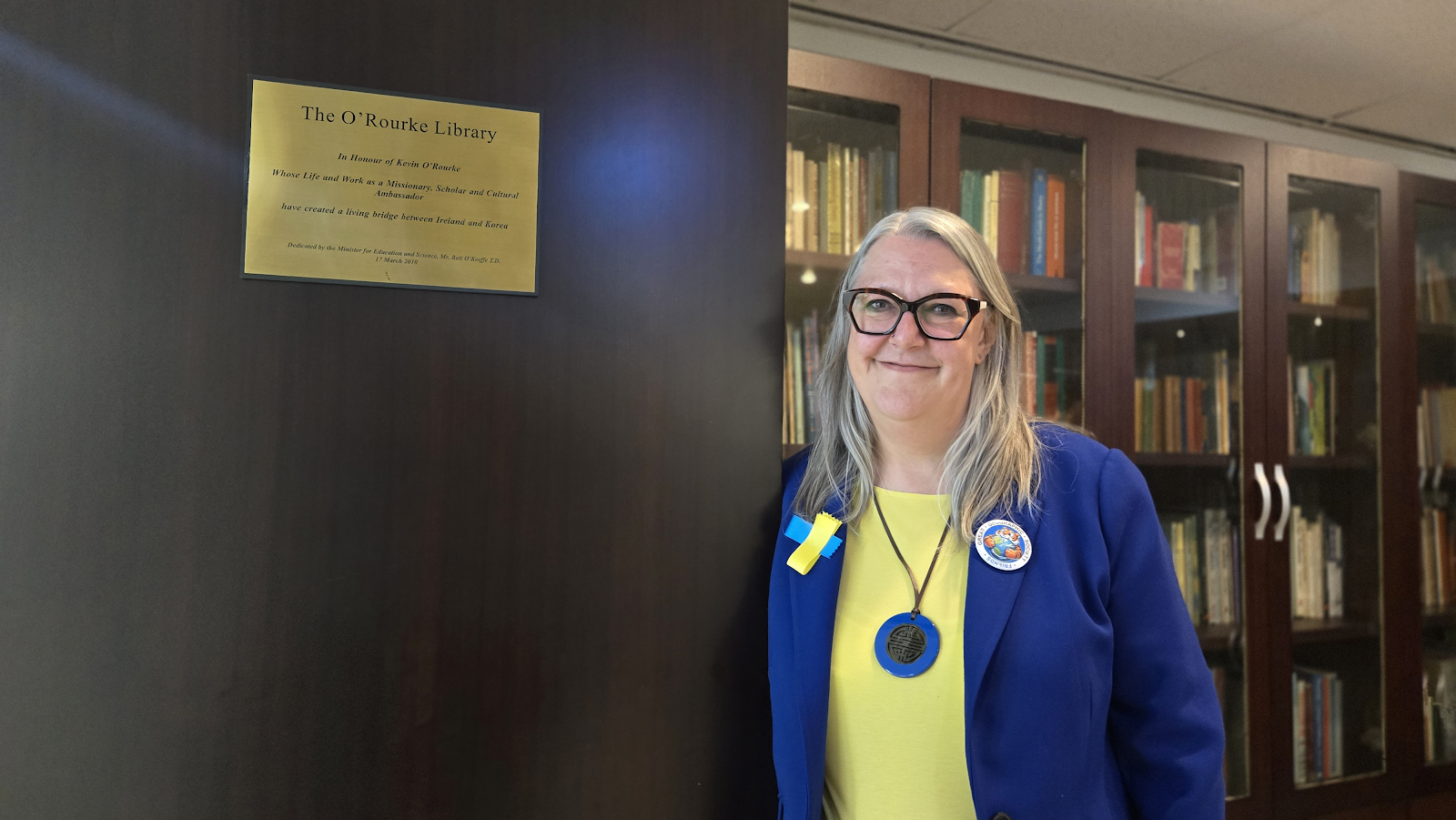 It is the O'Rourke Library surrounded by many books presented by the Irish missionary, Scholar and cultural Mabassador, Kevin O'rourke. He loved Korea so much as to bridge the gaps between Ireland and Korea through the linguistic and cultural channel.